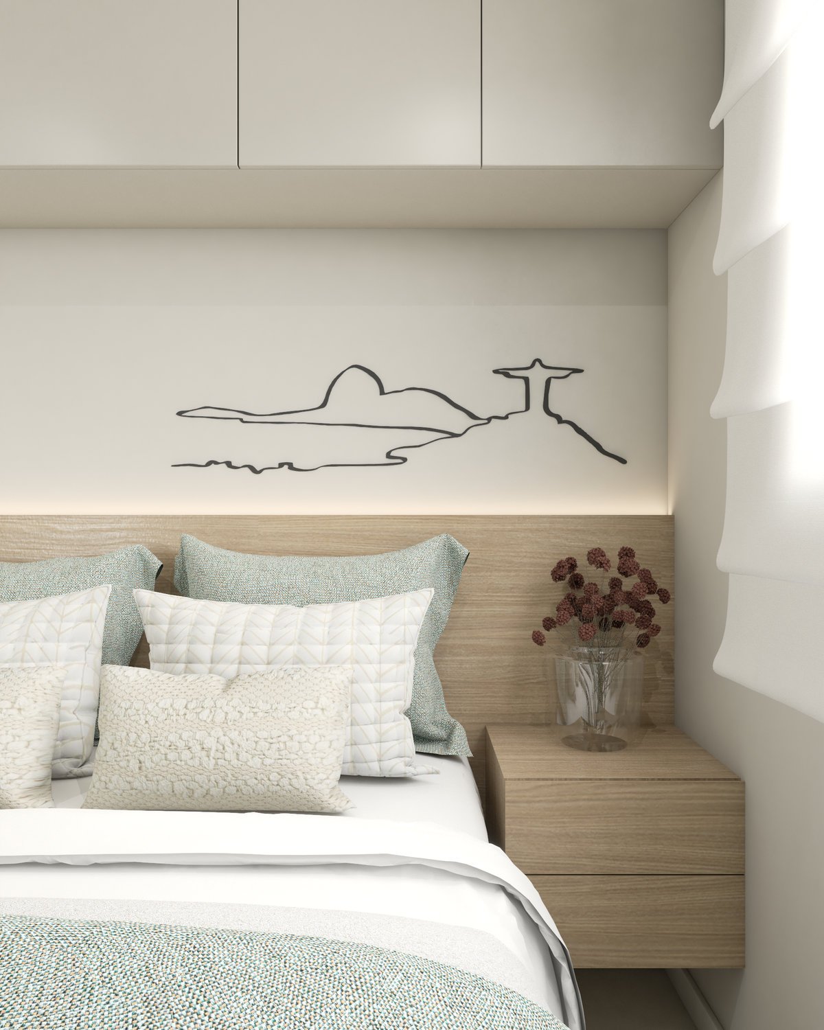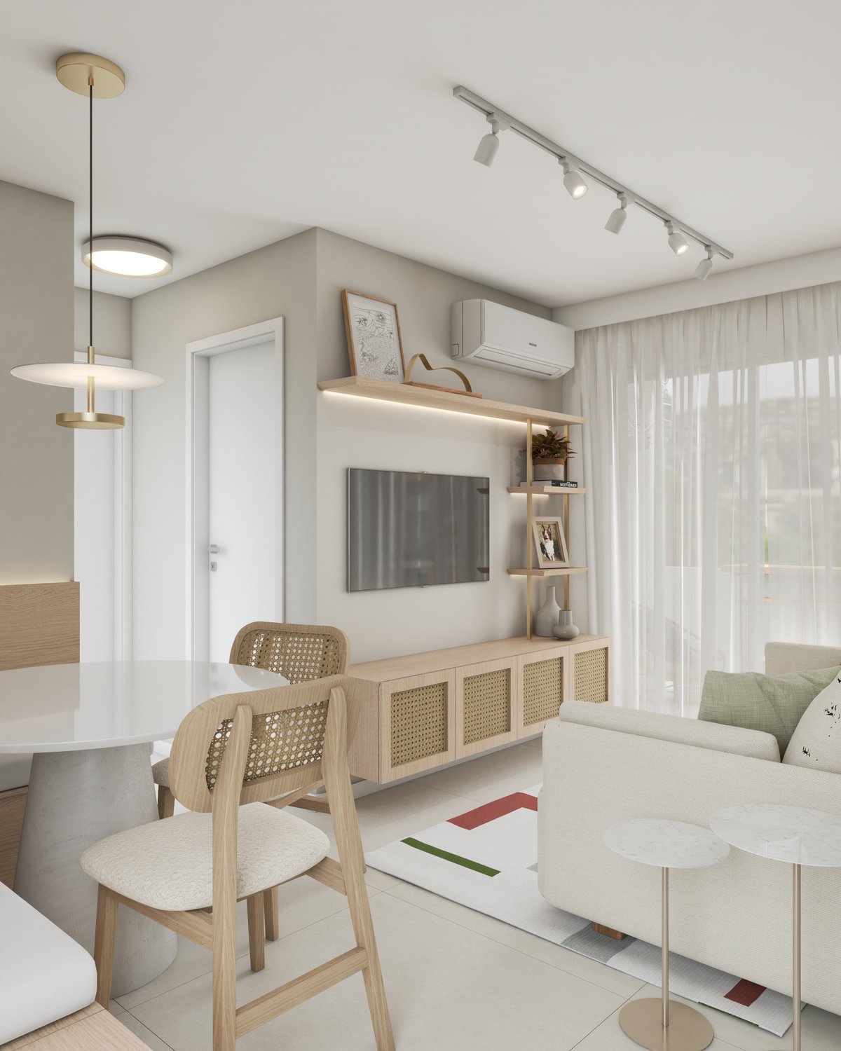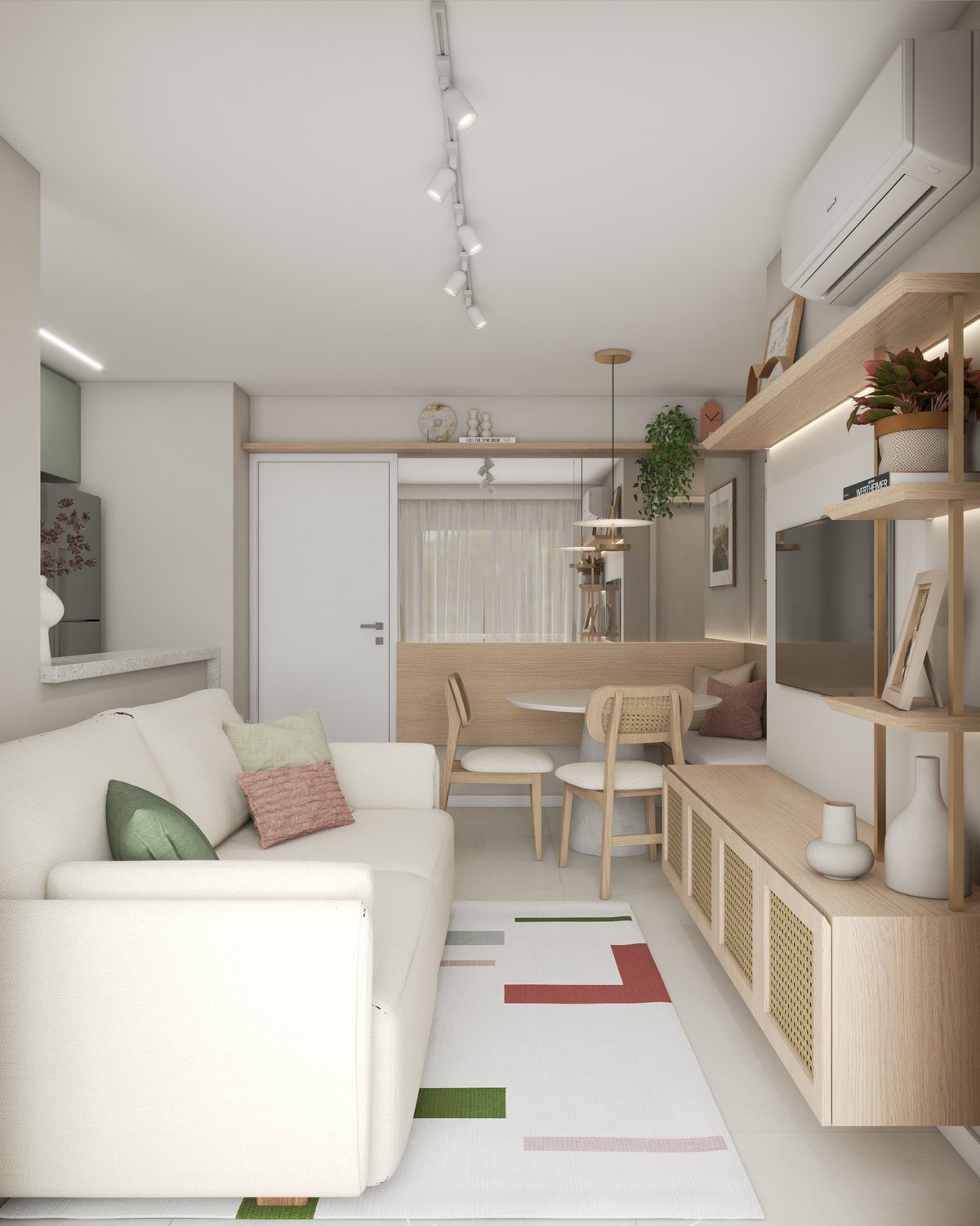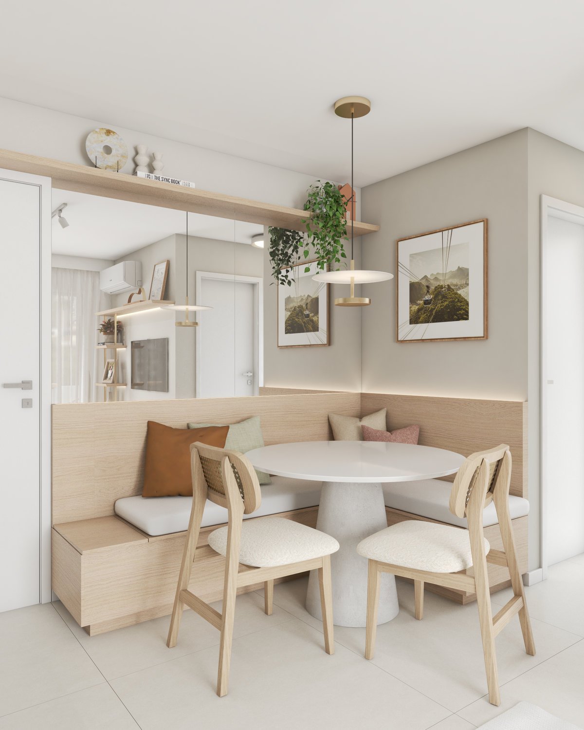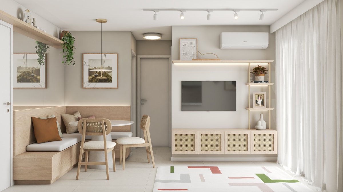 A base neutra do projeto abre espaço para cores pontuais em móveis, adornos e paredes, enquanto a marcenaria sob medida valoriza a funcionalidade e otimiza cada metro quadrado. Texturas naturais reforçam a atmosfera litorânea que conecta os dois à origem, enquanto pequenos detalhes fazem referência ao Rio, sempre com delicadeza e intenção.