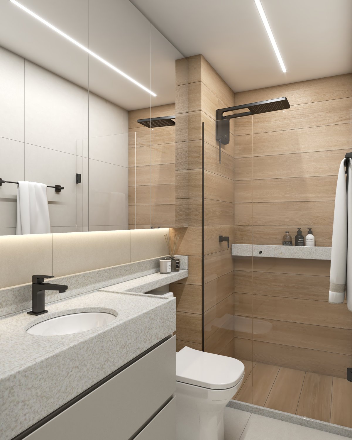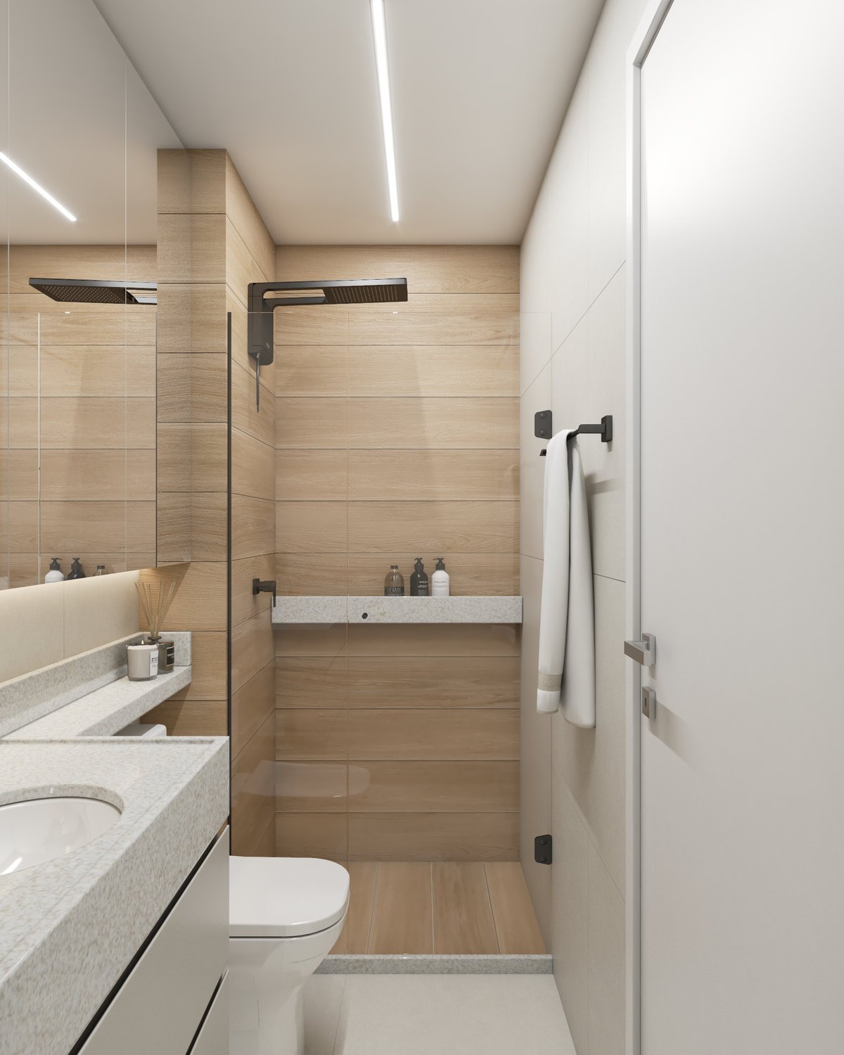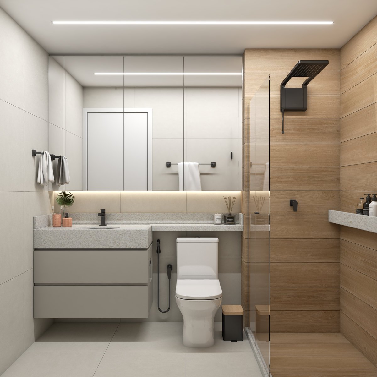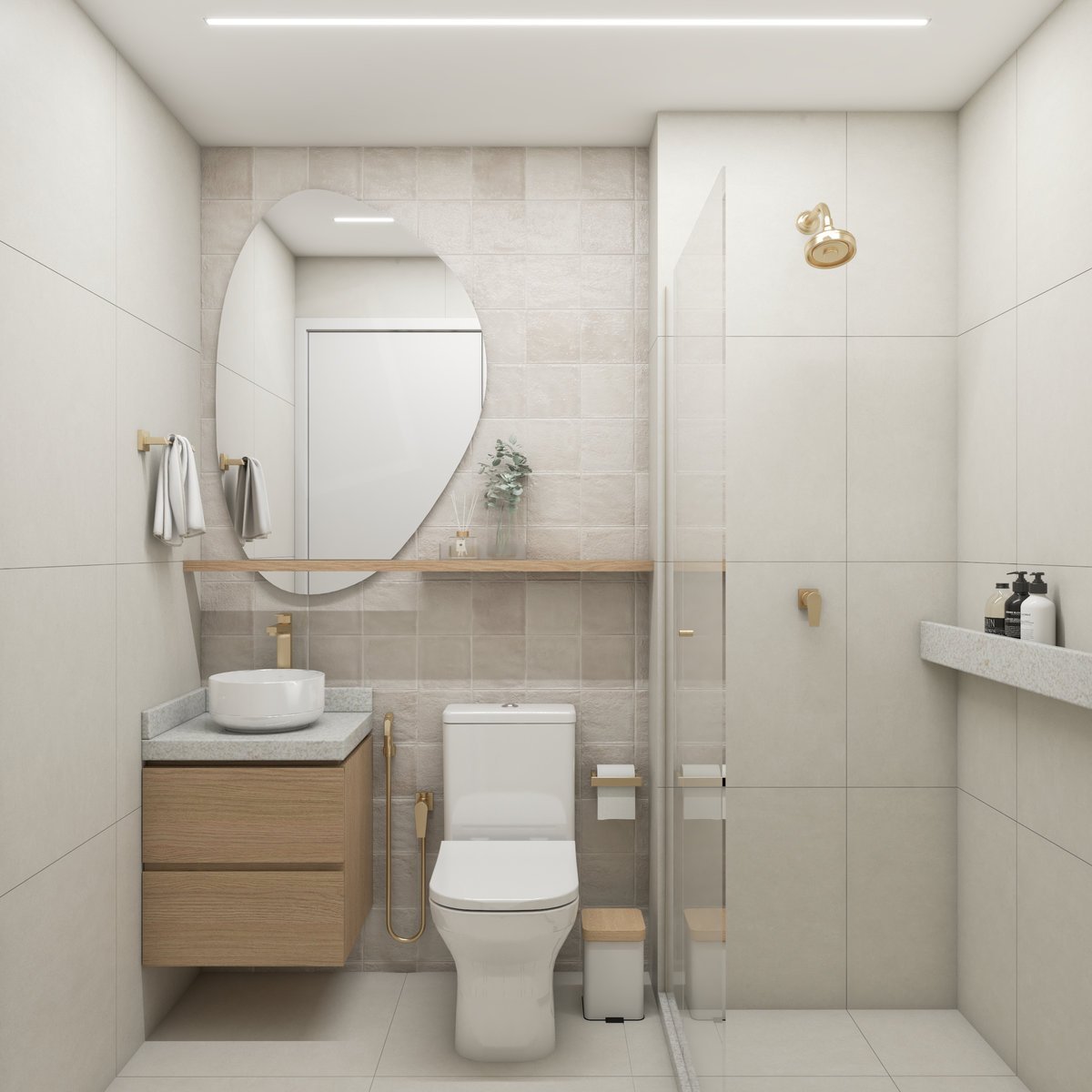 A base neutra do projeto abre espaço para cores pontuais em móveis, adornos e paredes, enquanto a marcenaria sob medida valoriza a funcionalidade e otimiza cada metro quadrado. Texturas naturais reforçam a atmosfera litorânea que conecta os dois à origem, enquanto pequenos detalhes fazem referência ao Rio, sempre com delicadeza e intenção.