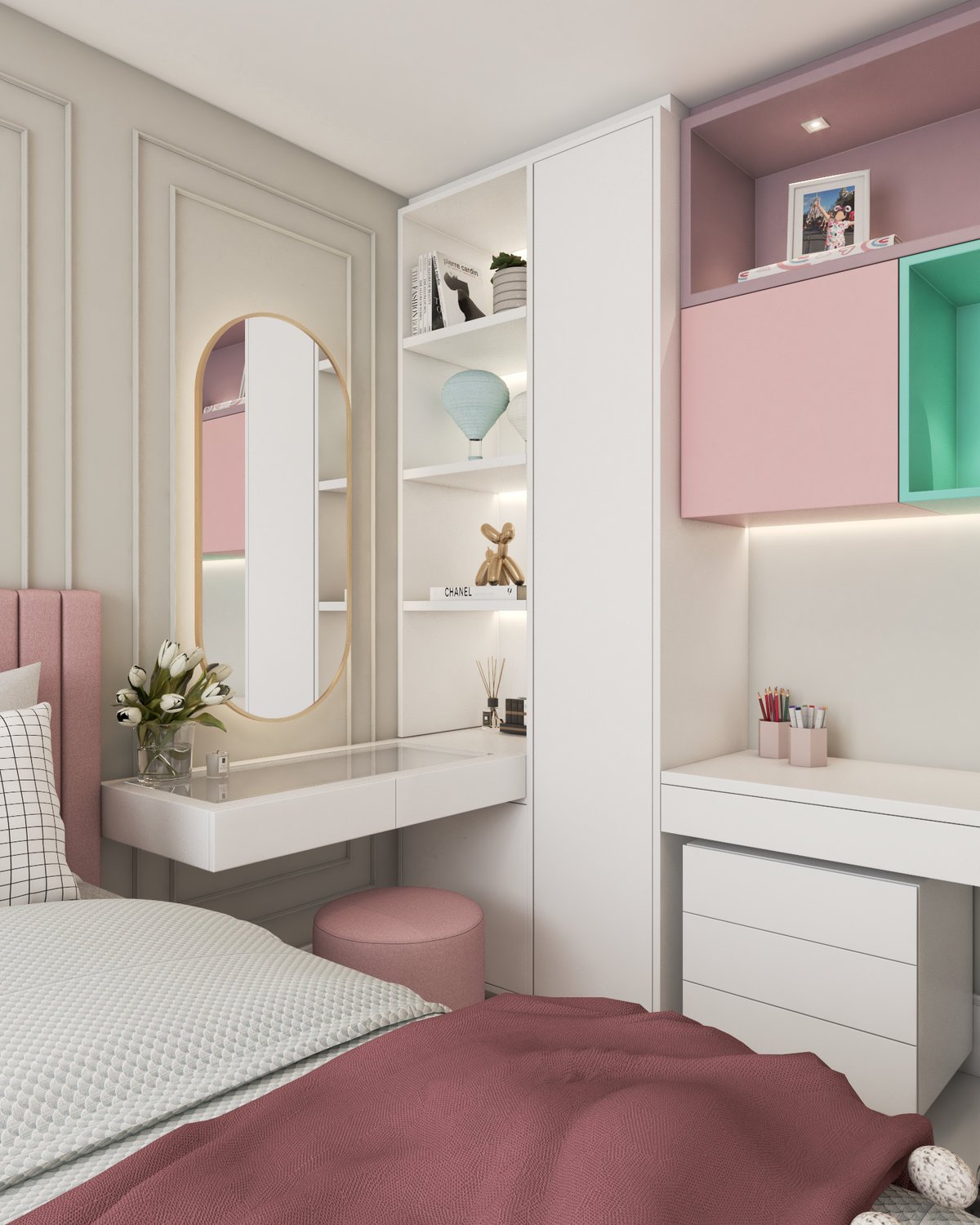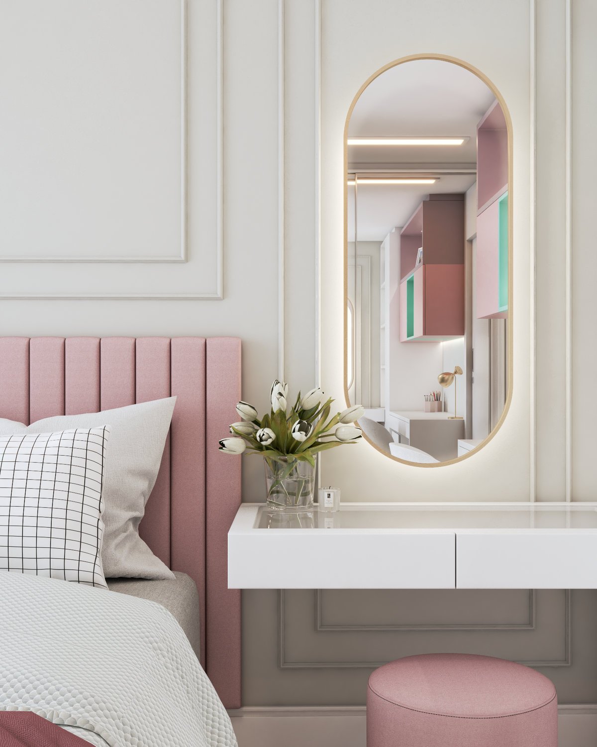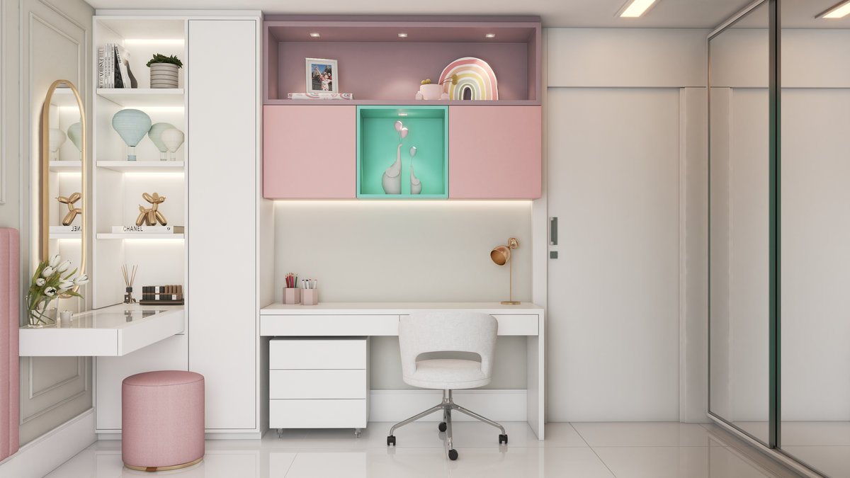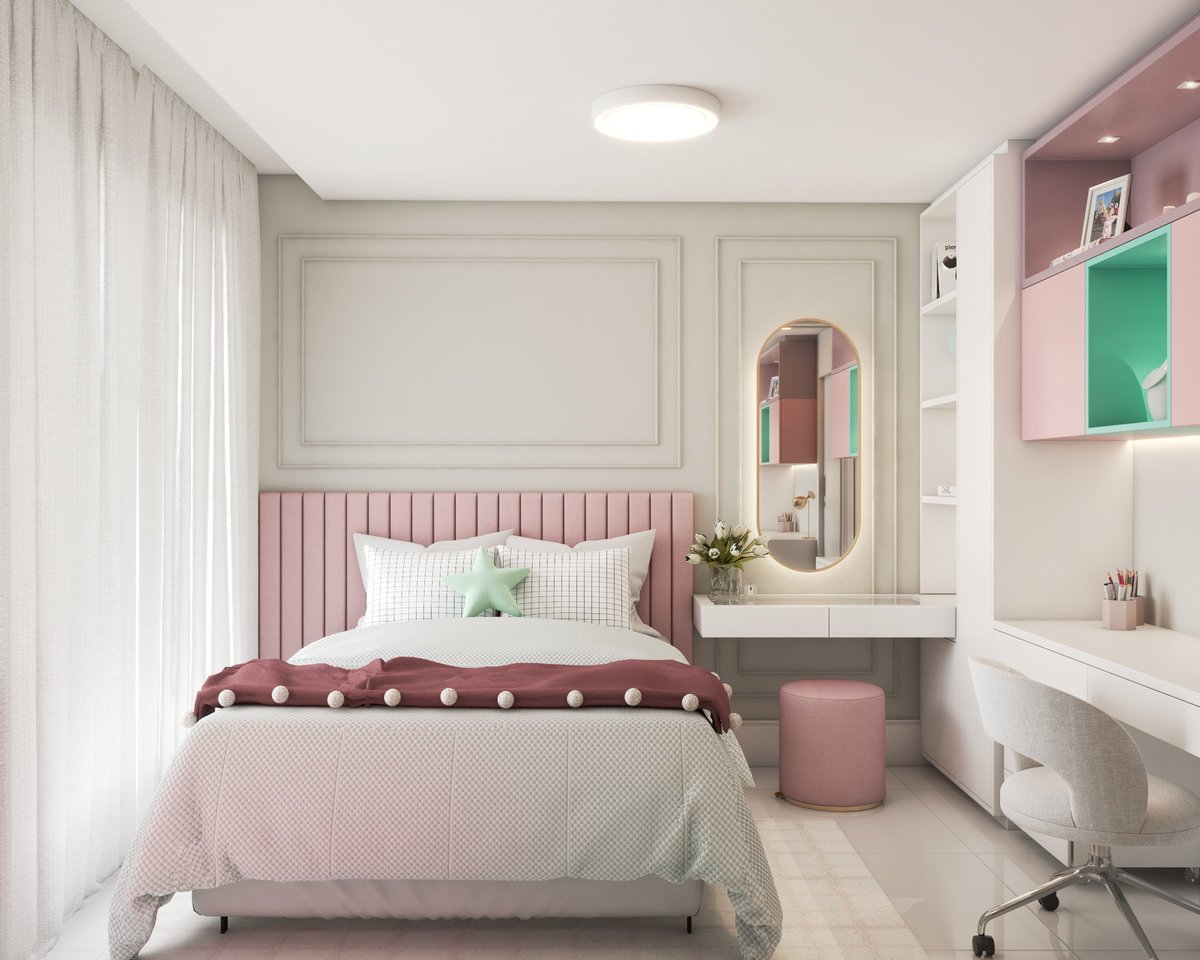 Para uma menina que ama maquiagem, rosa e o toque clássico dos boiseries, adaptamos esse ambiente para refletir sua nova fase. Cada detalhe foi pensado para unir delicadeza e estilo, acompanhando o seu crescimento.
